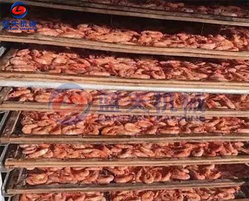 2、根據(jù)不同的海蝦河蝦品種,將烘干機(jī)的智能控制系統(tǒng)的溫度設(shè)置在50℃~70℃的中高溫為宜,時(shí)間約4小時(shí)左右,以水份為18%即可。烘干過程中一般要求稍大的循環(huán)風(fēng)量,風(fēng)速也比較高,避免水汽停留在蝦干表面,控制要點(diǎn)為抑制細(xì)菌生長、要保持海蝦、蝦仁烘干后的色澤。