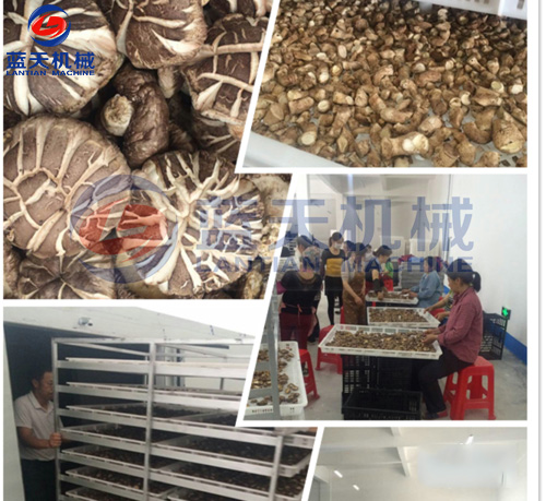1:準備好物料:采收前一天禁止?jié)菜?適時采收。香菇應在四五成熟時采收,一般采收均不能超過八成熟。采收的香菇分好類,先在陽光下暴曬2-3小時,以去除部分水分。裝盤時使菌蓋朝上,菌柄朝下,擺均放正,不可重疊積壓,以防傷菇而影響質(zhì)量。香菇采收后6小時以內(nèi)必須烘烤,如果有冷藏條件,保存時間可適當延長。
