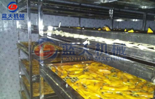 2:芒果烘干前期需要經(jīng)過清洗,去皮,切片,烘干,抽真空包裝幾個程序,今天我們注意介紹烘干過程的溫濕度控制技巧,芒果片烘干的量一般比較大,兩臺12P主機構成的烘干系統(tǒng),每批次可以處理2.5噸的新鮮芒果片,耗時30小時完成一批次干燥,系統(tǒng)時間分為5段完成,第一段55度,升溫,3小時,第二段60度,開始排濕,第三段62度,連續(xù)排濕,第四段58度,開始降溫排濕,最后一段55度,排濕鞏固。