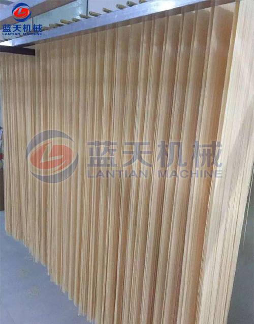 有些掛面容易在烘干過程中容易斷,有些不容易斷(玉米淀粉有幫助?。?,有些不能耐受溫度,溫度一高就容易斷,如果用太陽曬的話,盛夏上午10點鐘的太陽就能把掛面曬斷。有些溫度可以高一些。有些掛面一定要大量的風(fēng)量,否則中間的掛面就酸掉了!面條烘干機系統(tǒng)設(shè)計中非常重要的環(huán)節(jié)就是風(fēng)路設(shè)計,對于大部分掛面的烘干來說,使用頂出風(fēng)機組再結(jié)合上下風(fēng)路更利于風(fēng)路循環(huán),更利于面條的烘干。