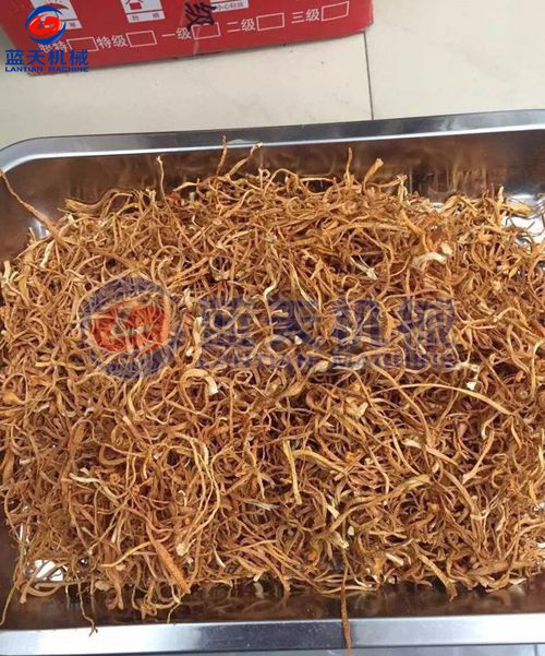 分級(jí)烘干處理過(guò)程中,有碎草產(chǎn)生和桔黃色子囊孢子粉,要分別凈選包裝以利增值收益。