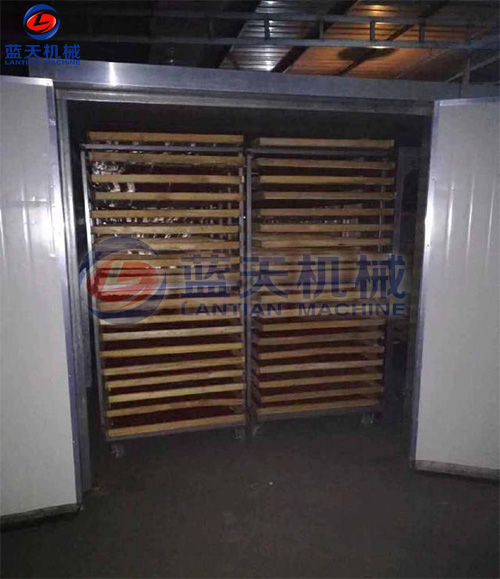 踩堆發(fā)汗:即將含水率75%一85%的辣椒,第一次將辣椒烘干到含水率50%踩堆發(fā)汗,再進(jìn)行第二次烘干。踩堆發(fā)汗在辣椒干燥工藝中是一個很重要的步驟,是否采用這一步驟對辣椒品質(zhì)和烘干時間、都有很大影響。辣椒在烘干過程中都有明顯的軟化和膨脹現(xiàn)象。踩堆發(fā)汗的主要作用是調(diào)質(zhì),使辣椒油向表面滲透,烘干后的辣椒顏色一致,紅潤光滑,并促使辣椒含水率趨于平衡。如不進(jìn)行踩堆發(fā)汗,烘干1000公斤辣椒,熱風(fēng)溫度40℃—60℃時 需時間63小時,踩堆發(fā)汗后則可縮短到40小時左右,且花黃殼顯著減少。