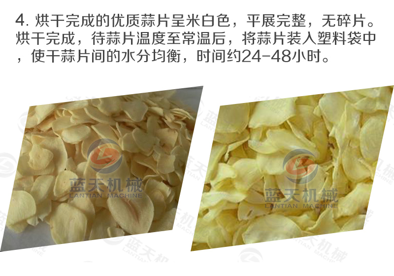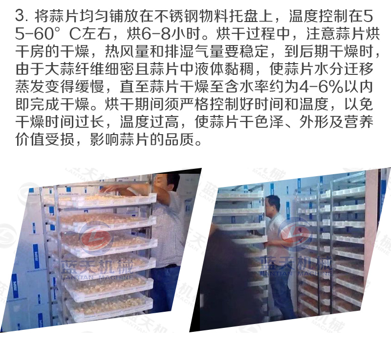 11、把蒜片均勻的鋪在蒜片烘干機(jī)設(shè)備的網(wǎng)格盤內(nèi),將網(wǎng)格盤插入物料車,將物料車推進(jìn)烘干內(nèi)。蒜片烘干過程中,溫度應(yīng)控制在55~75 ℃之間,烘干時(shí)間為10~12小時(shí)。烘干后的蒜片標(biāo)準(zhǔn)為:片形正常、色澤凈白,水分含量為4~5%。