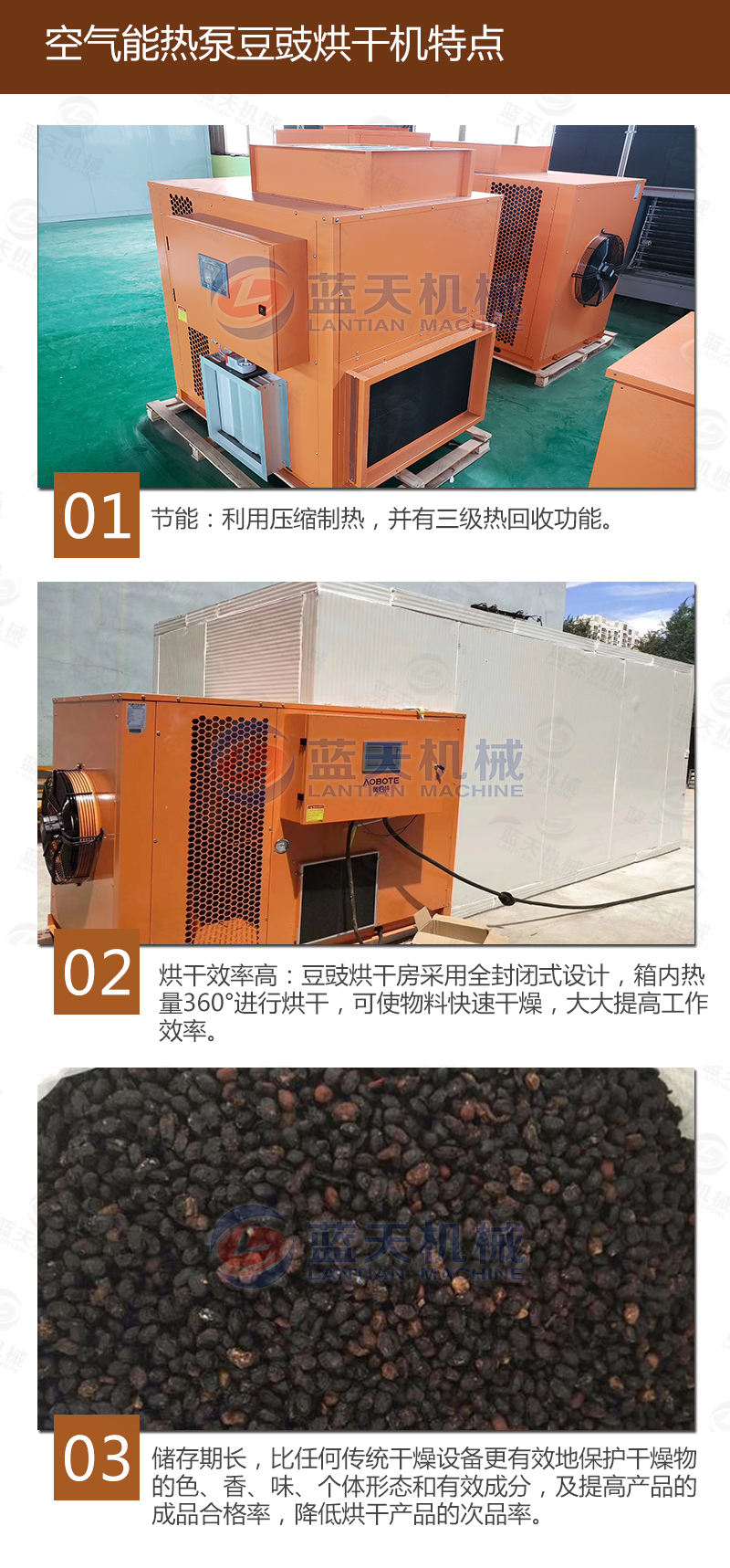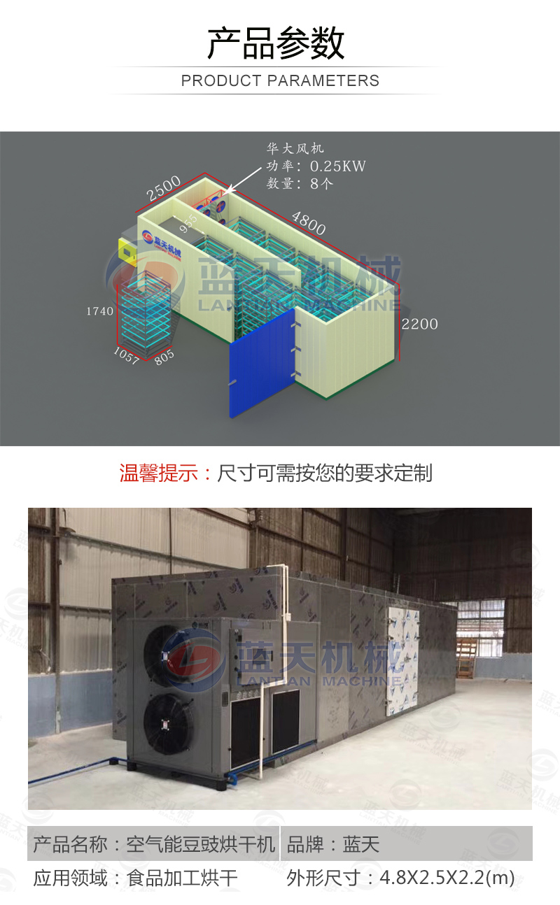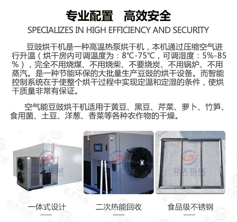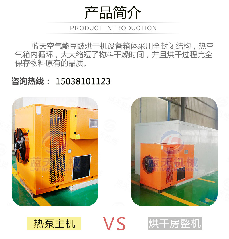 豆豉富含蛋白質(zhì)、各種氨基酸、乳酸、磷、鎂、鈣及多種維生素,色香味美,我國南北部都有加工食用。但若不注意加工藝,會致使品質(zhì)下降,甚至霉變,造成經(jīng)濟(jì)損失。傳統(tǒng)上使用太陽光曬制,但是生產(chǎn)效率低下,并且在曬制過程中極容易有污染,本文介紹使用一種基于空氣能熱泵技術(shù)的豆豉烘干設(shè)備,大大加快了豆豉的生產(chǎn)流程。