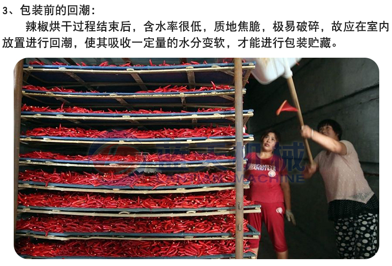 五:辣椒經(jīng)辣椒烘干機烘干后,選檢要在干辣椒自然回潮一段時間后進行,否則干辣椒容易破碎;