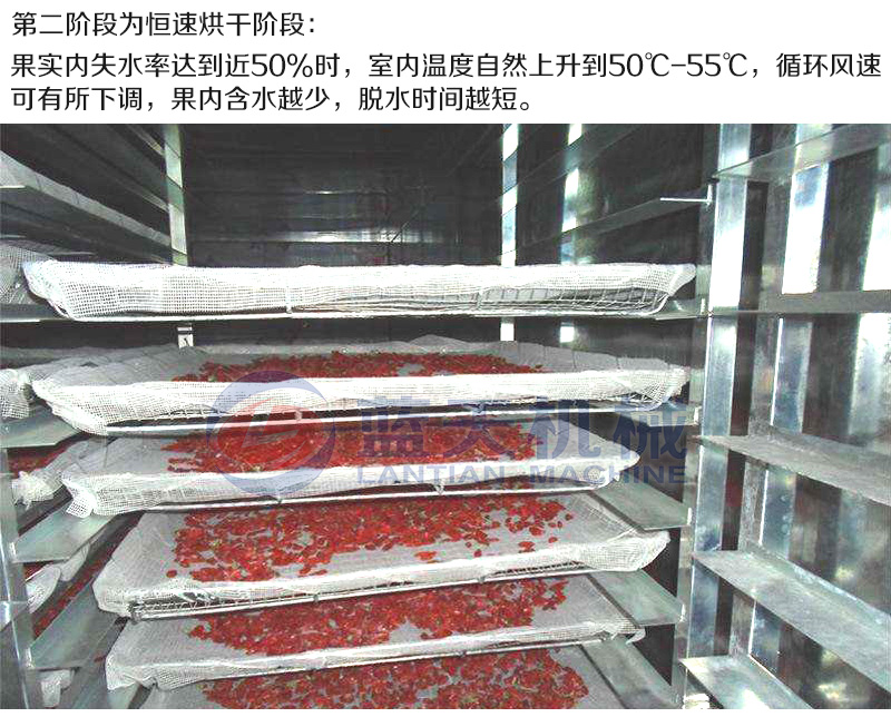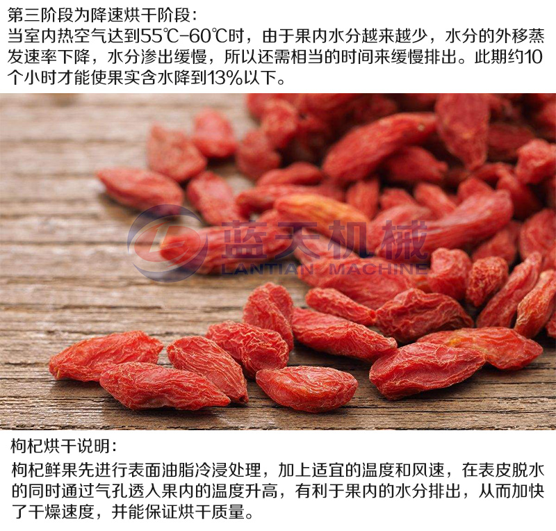 高濕低溫段,溫度小于50度,范圍40度~50度,避免高溫高濕造成枸杞顏色的變化,觀察枸杞表面水汽變化,隨時排潮,這段時間應在3~3.5小時。