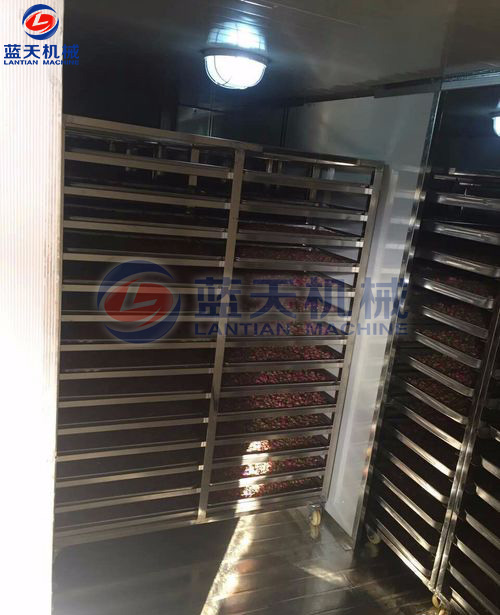 裝滿花蕾的物料車要輕輕推入烘干房,關(guān)閉烘干房室門升溫,嚴格控制室內(nèi)溫度、依次順序溫度慢慢提升,采用循環(huán)風(fēng)路,確?;ɡ俑蓾窬鶆?,色澤鮮艷。