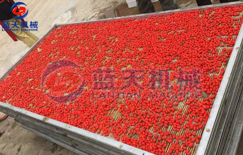 第一階段是升速干燥階段。干燥室內(nèi)溫度上升到35℃-40℃,循環(huán)風(fēng)速2.3米/秒,溫度37℃-45℃。循環(huán)風(fēng)速1.3米/秒時(shí),熱風(fēng)的傳遞和鮮果游離水分的擴(kuò)散蒸發(fā)加快,尤其是果實(shí)皮層失水多達(dá)50%,表皮出現(xiàn)曲皺,果肉內(nèi)含結(jié)構(gòu)水也從皮層氣孔開始慢慢滲出蒸發(fā),次期的升速脫水,果內(nèi)糖分濃度加大,抑制了果內(nèi)活化酶的活性,保護(hù)了多糖、維生素、氨基酸等主要成分不被轉(zhuǎn)化或損失,尤其對(duì)紅色素保護(hù)好,干燥的果實(shí)色紅質(zhì)量高。這個(gè)階段歷市時(shí)20個(gè)小時(shí)左右。