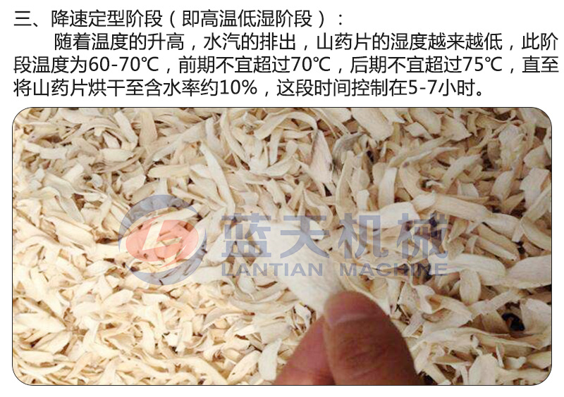 4、小切片烘干時,山藥烘干機(jī)的溫度不能太高,一般控制為70-90℃,時間設(shè)置為6-7個小時。大切片烘干時,山藥烘干設(shè)備的溫度設(shè)置要高點(diǎn),一般控制在80-100℃,烘干時間為9個小時。碎切片烘干則溫度要求較低,烘干時間為5個小時,溫度設(shè)置為60-80℃。