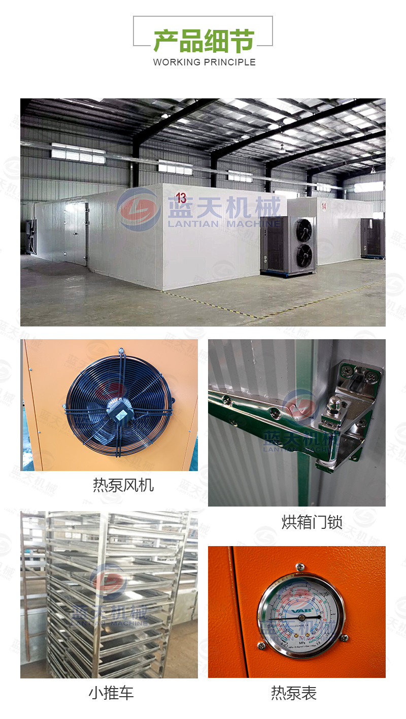 1.熱源空氣能熱泵機組。2.烘干機保溫房體。3.烘干機內(nèi)部熱風(fēng)循環(huán)裝置。4.自動排濕裝置。5.溫濕度智能控制裝置。6.裝放獼猴桃干的物料小推車和物料托盤。