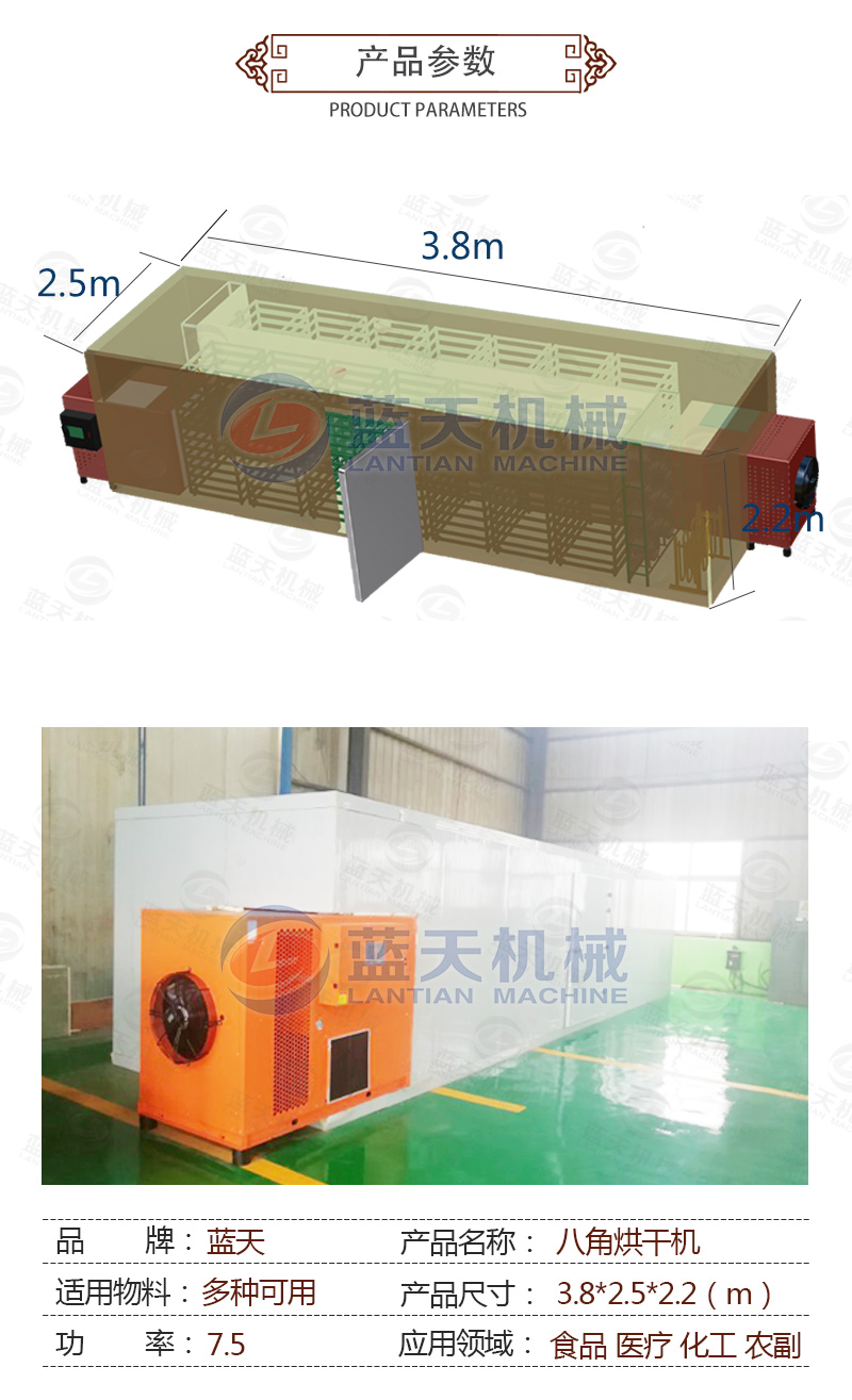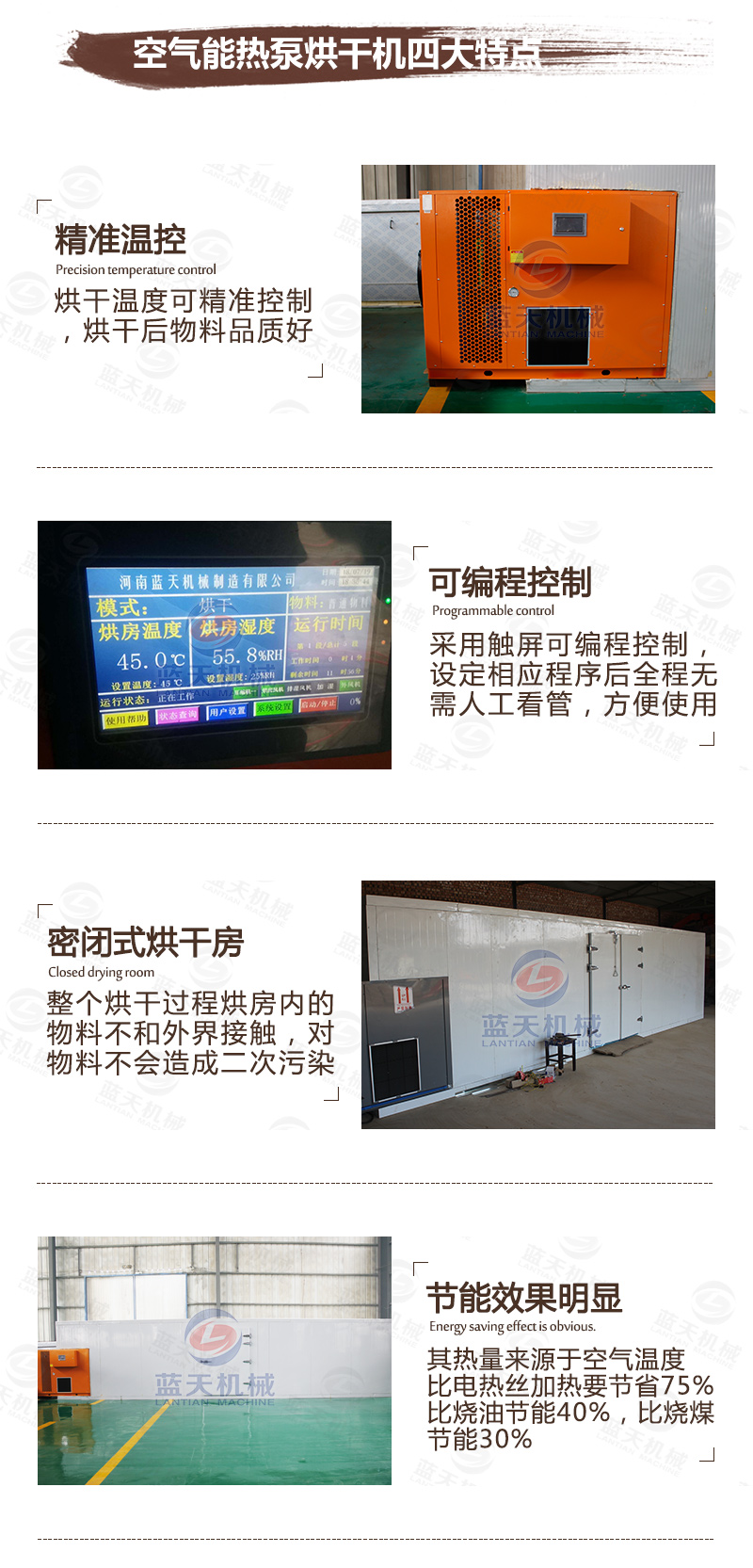 結合以上問題,新的八角烘干機出現(xiàn)了,這種設備是通過少許電能驅動壓縮機做功,從而使系統(tǒng)中的冷媒吸熱放熱來實現(xiàn)熱量從高位轉移到低位的新能源設備,是一種氣流干燥設備,節(jié)能環(huán)保,智能化控制,不再看天氣,不再需要人守著,一鍵啟動,自動烘干,自動停機。